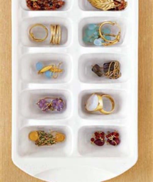 You can use old ice cube trays to store jewelry. Things like earrings and rings fit perfectly into those small individual slots and this will help you to keep all of your jewelry separated and perfectly organized. This is a great idea for ice cube trays that may have cracks in them. Liquids may not stay in but jewelry certainly will. You can even stack multiple trays in a dresser drawer to save even more space and to keep all of your jewelry where you can easily find it.Instructions and Project Credit – Realsimple