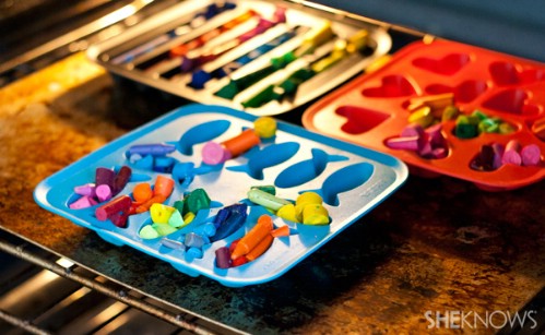Instead of throwing out old crayons when they get broken or too small, simply peel the paper off, put them together in a silicone ice cube tray and bake for a few minutes. The crayons will melt into each other creating new crayons. If you use shaped ice cube trays you will have really fun shaped crayons for the kids. You can create new crayons of the same color or just mix a lot of different colors together. Note that you will have to use silicone trays for this as plastic will melt in the oven.Instructions and Project Credit – Sheknows