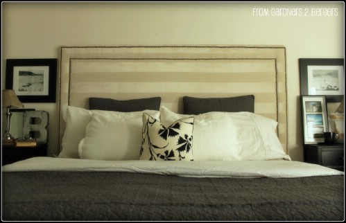 This DIY headboard is lovely with buttons to match the fabric cover but what makes it really special are the two sides that turn into the bed just a tad. It’s unique and really easy to make. All you need is some plywood, your fabric of choice and some rather large buttons to match. You’ll want something under the fabric to make it extra cushiony. The design makes it look like a daybed or couch, which is really neat. You just cover and tack or staple into place and you can cut the plywood for any size so it doesn’t matter what size your bed is, you can make this headboard for it.