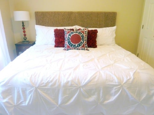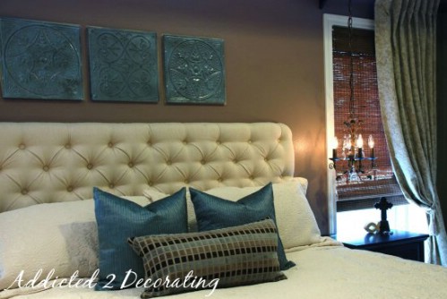 If you want a headboard that is cheap, easy to make and really unique, this faux tile headboard fits the bill. The neat thing is that these tiles are foam and they cost less than $5 in many online stores. You just mount them with mounting tape and you can paint them whatever color you want. If you are looking for a great metal tile look, just spray them with spray paint that will give them a great hammered metal look. White looks beautiful and the best thing is (aside from how cheap and easy it is to create, that is) they are foam so they’re really comfortable. You know, in case you bang your head on them.